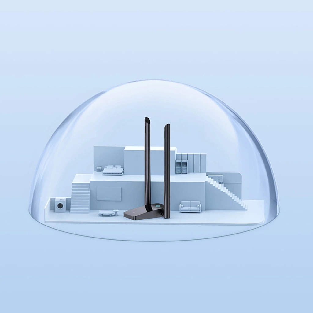 Konstrukcja urządzenia pozwala na regulację kąta ustawienia anten w szerokim zakresie. Zysk energetyczny anteny sięgający 5 dBi sprawia, że karta radzi sobie świetnie nawet w pomieszczeniach oddzielonych ścianami od punktu dostępowego WiFi. Dzięki dołączonemu kablowi USB o długości 1 m możesz ustawić kartę Baseus w takim miejscu, które pozwoli na jeszcze lepszy odbiór sygnału.