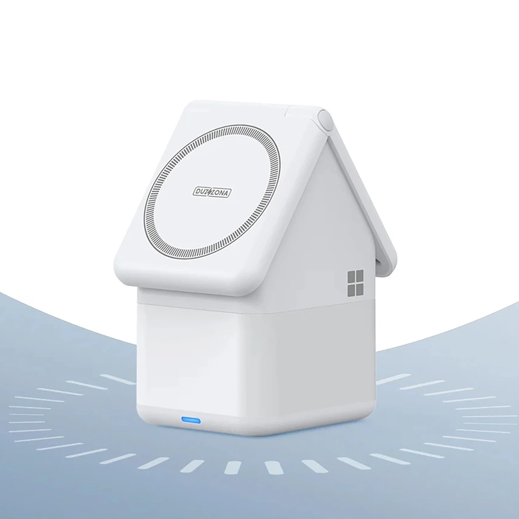 Ładowarka bezprzewodowa 4w1 DUZZONA W20 z funkcją lampki nocnej. Pozwala na ładowanie indukcyjne telefonu, zegarka smartwatch, zestawów słuchawkowych. Wspiera ładowanie z MagSafe dla iPhone z serii 12 i nowszych. Przeznaczona dla urządzeń o zapotrzebowaniu na moc do 15W.