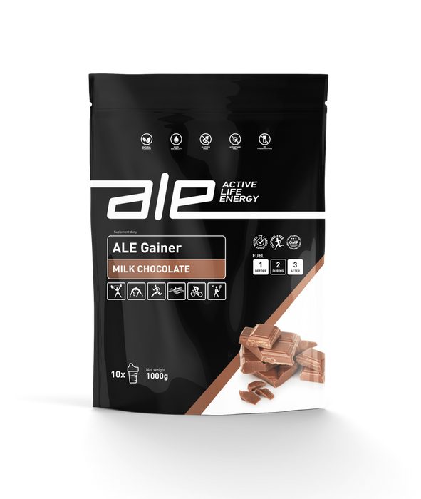 ALE Gainer to formuła węglowodanowo-białkowa w stosunku 5:1 przeznaczona do typowego budowania masy i siły mięśniowej. Zastosowane węglowodany złożone pozwalają na stopniowe uzupełnianie glikogenu mięśniowego i jednocześnie dostarczają energii niezbędnej do przebiegu procesów anabolicznych. Jako węglowodany złożone nie powodują również gwałtownego wzrostu poziomu insuliny we krwi, co pozwala na ograniczenie lipogennego działania insuliny. Specjalnie wyselekcjonowany koncentrat serwatki (WPC 80) został wzmocniony aminokwasami BCAA w dobrze przyswajalnej formie Instant, dzięki czemu ALE Gainer skutecznie stymuluje procesy anaboliczne zachodzące w mięśniach. Ponadto, formuła ALE Gainer została wzbogacona o kluczowe witaminy regulujące przemiany białkowe w organizmie oraz wspierające regenerację po ciężkich i intensywnych sesjach treningowych. Optymalne proporcje zastosowanych w ALE Gainer składników pozwalają na szybkie i skuteczne wykorzystanie odżywki w procesie treningowym ukierunkowanym na szybki przyrost masy mięśniowej.