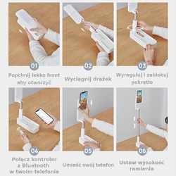 Superb, multifunctional stand with LED lighting by USAMS US-ZB209. Material: Aluminum alloy + ABS + PC Size: 210*80*63mm Weight: about 1116g Stretching height: 40-126cm Input: 5V (0.2A) Fill light battery capacity: 1000 mAh; Time wireless usage: 3-12 hours Battery capacity of remote control: 50 mAh; BT connection distance: ?10 meters Applicable phone width: 50mm ~ 82mm Features: 1. 3-in-1 live show/easy photo taking/wireless remote remote control. 2. Double-sided fill light, adjustable color temperature/brightness. 3. 8 parts extendable in height 8 sections extendable up to 126 cm, 360° rotatable, last section can be angled 45° 45°. 4. Battery capacity 1000 mAh, long service life. 5. Portable and convenient.
