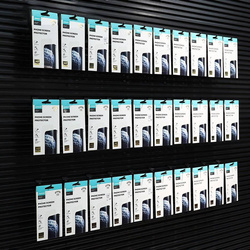The tempered glass is available in the collective packaging which contains as many as 40 pieces. This set is intended mainly for wholesale. The box is a perfect match for the store display cabinet, where it looks interesting and aesthetic.