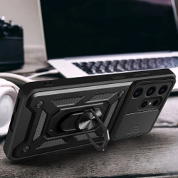 Custodia corazzata della serie Di cui è fatto l'armatura ibrida Camshield termoplastico e materiale durevole che imita l'aspetto dell'acciaio. La cover è montata: protegge perfettamente il telefono dai danni causati da cadute o graffi (ad esempio dalle chiavi portate in tasca). La custodia ha una copertura scorrevole per la fotocamera posteriore. Grazie ad esso, il vetro della fotocamera è protetto dai graffi. C'è anche un ulteriore vantaggio per le persone che danno valore alla privacy e alla sicurezza dei propri dati. La fotocamera coperta impedisce l'accesso alla registrazione video se qualcuno ottiene l'accesso remoto al telefono e attiva la visualizzazione dalla fotocamera principale. I bordi rialzati attorno allo schermo lo proteggono dai graffi quando viene posizionato su una superficie piana. Ha un anello metallico incorporato che consente di utilizzare comodamente il telefono con una mano e funge anche da supporto. La piastra metallica integrata ne consente il fissaggio ai supporti magnetici per auto. Ha pulsanti reattivi e ritagli delle porte. Perfetto per le persone che apprezzano lo stile, la qualità e vogliono prendersi cura del proprio dispositivo.