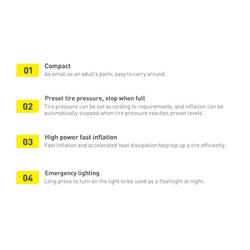 Riteniamo che i gadget progettati per mantenere un'auto e supportarne il funzionamento continuo debbano essere affidabili e quindi realizzati in modo solido. Pertanto, la pompa è costituita interamente da un motore metallico ad alte prestazioni con magneti permanenti. Grazie alla struttura stabile, garantisce un gonfiaggio rapido al livello richiesto.