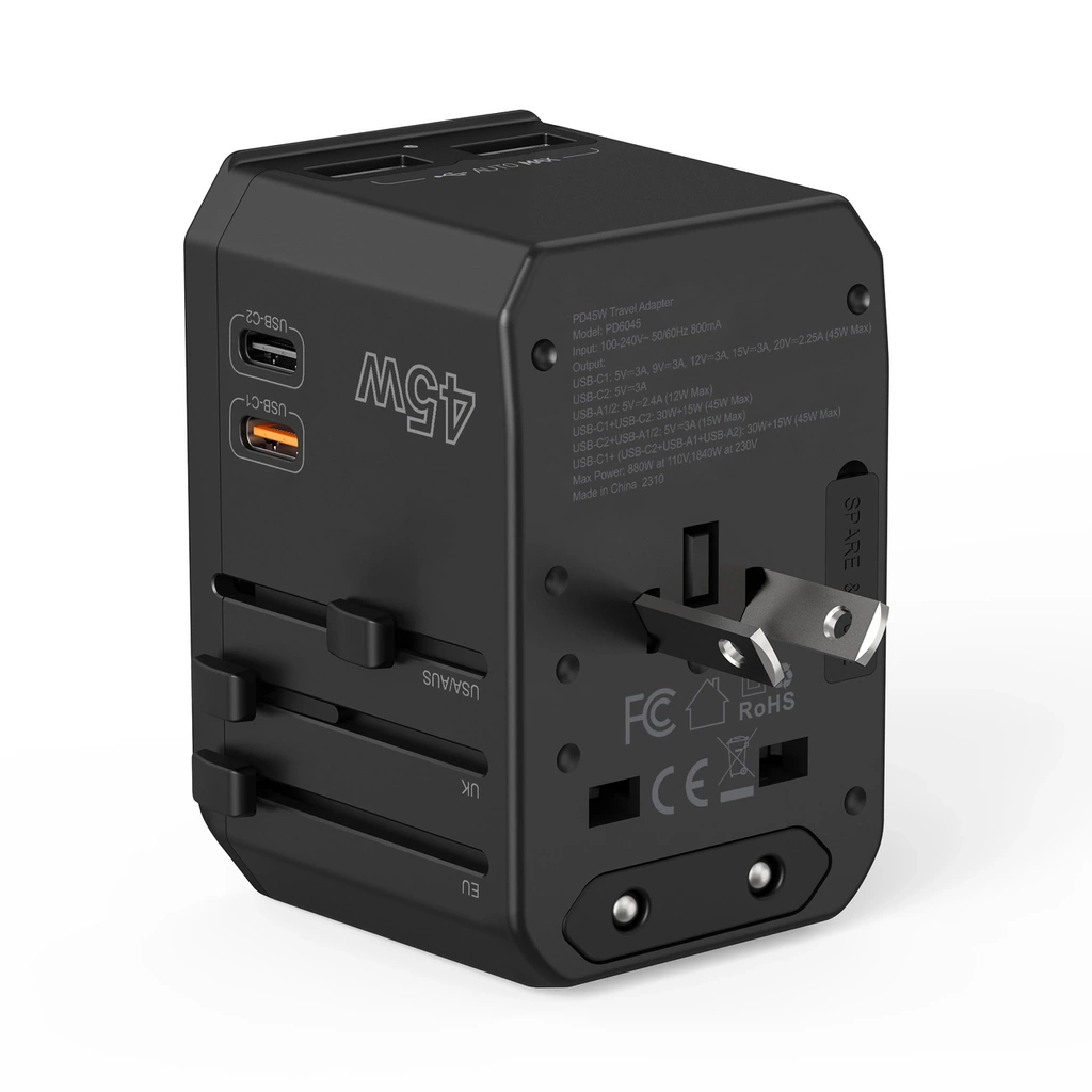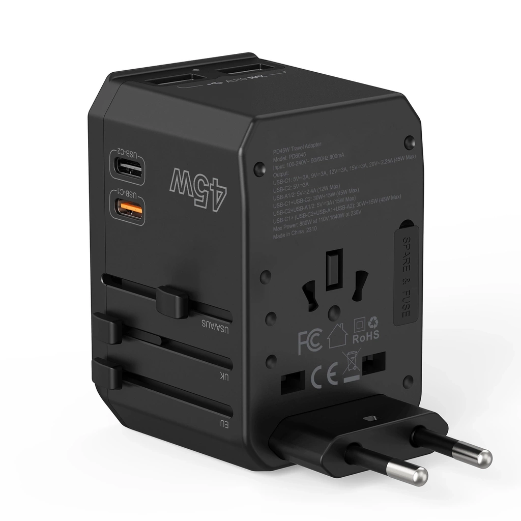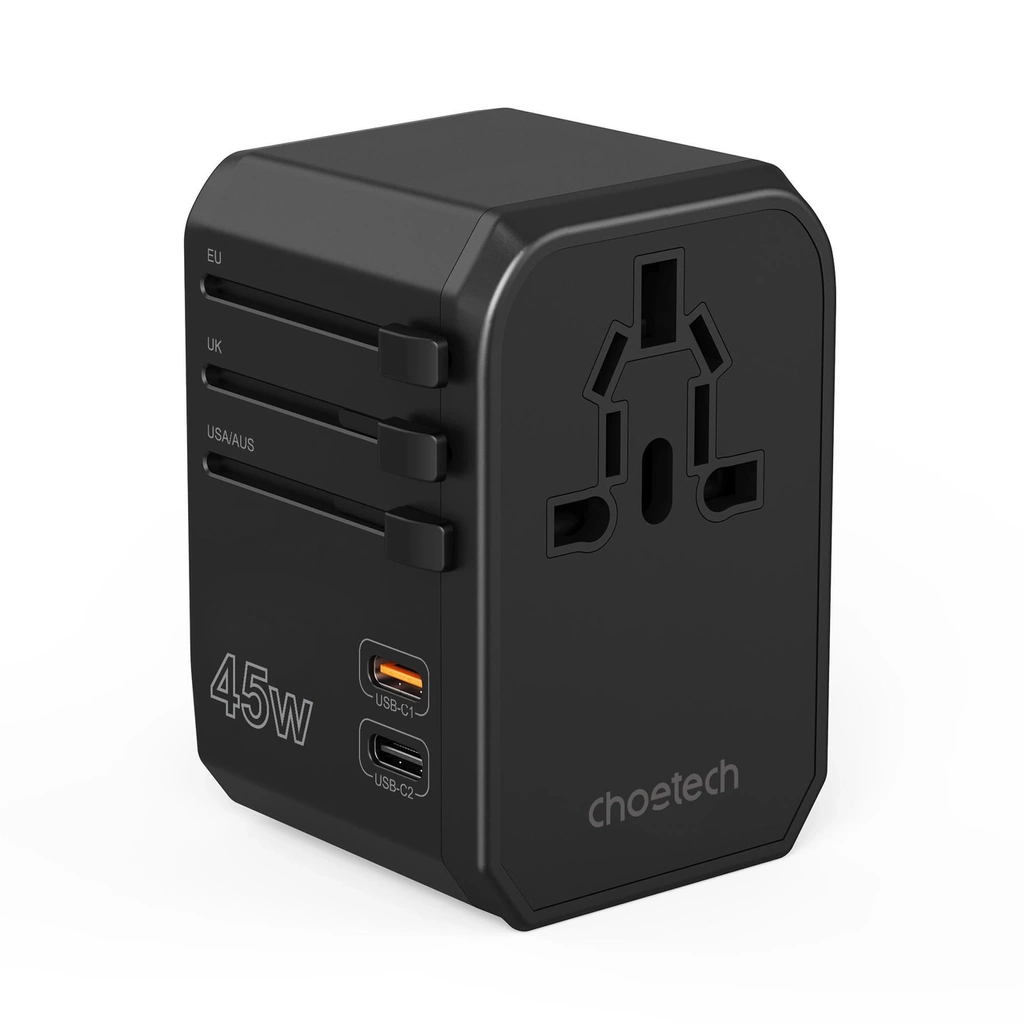 Caricabatterie da viaggio Choetech PD6045 GaN con connettori USB-C e USB-A con 4 spine (US, EU, UK, AU) - Nero