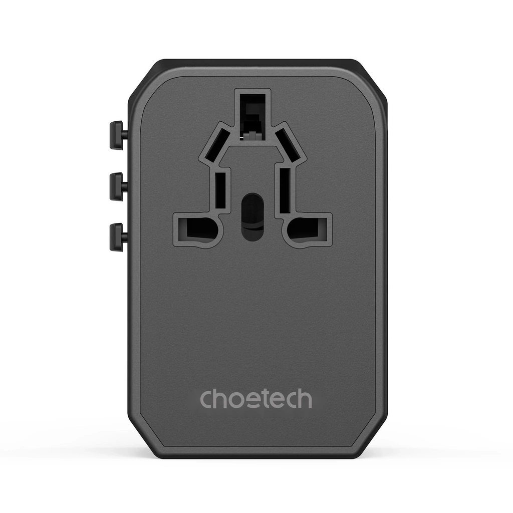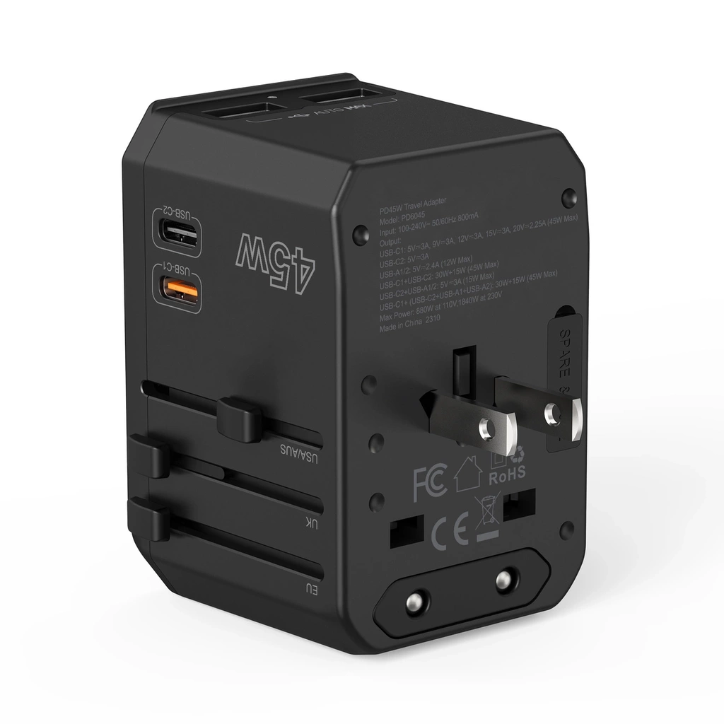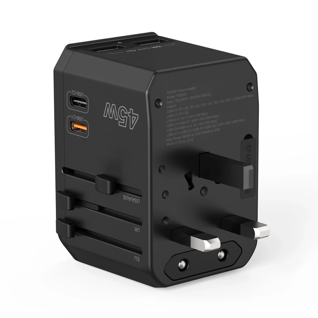 Caricabatterie da viaggio Choetech PD6045 GaN con connettori USB-C e USB-A con 4 spine (US, EU, UK, AU) - Nero