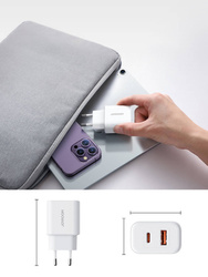 Caricabatterie rapido con due porte: USB-C e USB-A di Joyroom. Il dispositivo è piccolo e maneggevole, quindi c'è spazio anche nella borsetta di una donna. Questo gadget estremamente pratico ha anche una serie di funzioni di sicurezza, grazie alle quali il suo utilizzo è estremamente sicuro.