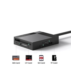 Il lettore di memory card Ugreen 4in1 è un piccolo dispositivo che fornisce il trasferimento dati tramite USB 3.0 con una velocità fino a 5 Gbps. È compatibile con tutti i sistemi operativi disponibili sul mercato e funziona in modalità Plug & Play, non richiede l'installazione di driver aggiuntivi.