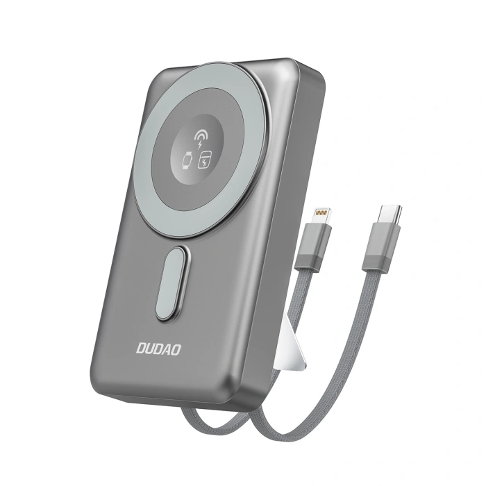 Powerbank Dudao K29 10000mAh PD 20W z MagSafe z metalową obudową, podstawką i wbudowanymi kablami USB-C/Lightning - szary