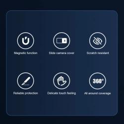 Na tylnej części pokrowca znajduje się przesuwana osłona na kamerę. Chroni szkło aparatu przed porysowaniem w trakcie codziennego używania. Kiedy potrzebujesz nagrać film lub zrobić zdjęcie wystarczy, że przesuniesz zaślepkę odsłaniając obiektyw.