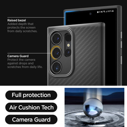 Spigen Enzo Aramid es funda, que combina la última tecnología y materiales para ofrecer la máxima protección a tu smartphone sin renunciar a un aspecto elegante. Está fabricada con fibra de aramida avanzada, conocida por su extrema durabilidad. El acabado de aluminio de precisión no sólo le da un aspecto único, sino que también proporciona una protección adicional contra impactos y daños.