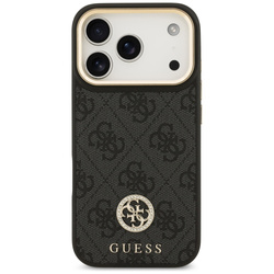 W dolnej części etui znajduje się ozdobny emblemat Guess 4G, udekorowany połyskującymi kryształkami, a całość dopełnia subtelne logo Guess.