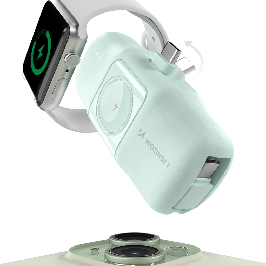 • Mini powerbank Wozinsky WF16-YCS 5000mAh 15W USB-C z wbudowanym kablem USB-C i ładowarką do Apple Watch - zielony