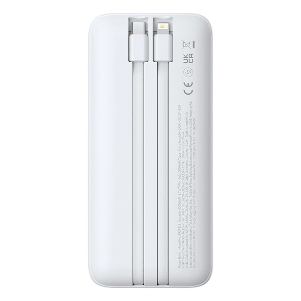 • Powerbank Baseus Lipow 20000mAh 22,5W z dwoma wbudowanymi kablami z dodatkowym kablem Baseus Simple USB-A - USB-C 3A 20cm - biały