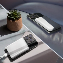 Powerbank umożliwia zarówno ładowanie urządzeń kablem poprzez port USB-C, jak i bezprzewodowe ładowanie z mocą do 15W.