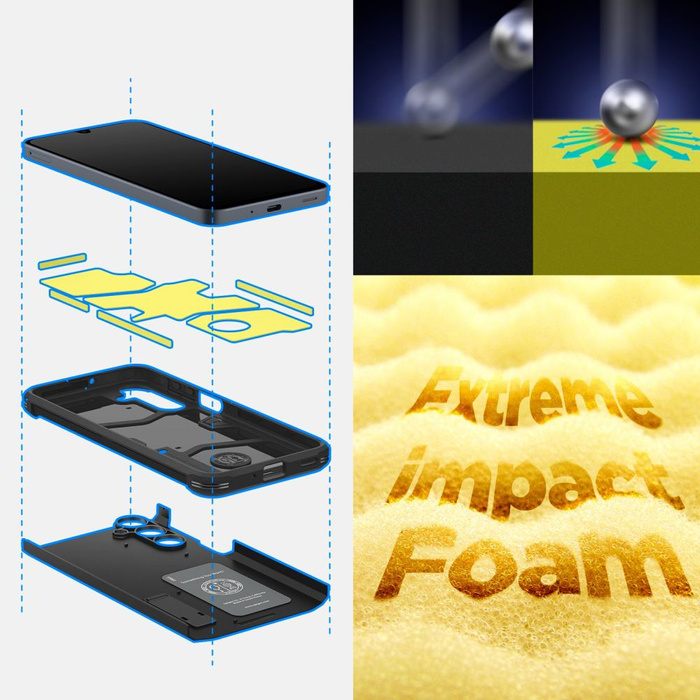 schermo smartphone L'interno della custodia è riempito di schiuma tecnologica, che fornisce un ulteriore strato di protezione da urti o cadute del dispositivo.La forma leggermente rialzata della custodia circonda la fotocamera e la protegge dai graffi, sollevandosi appena sopra la superficie piatta. È dotata di coperture per i pulsanti e di ritagli per le porte.