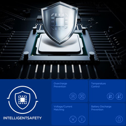 Los sistemas de protección integrados incluyen prevención de sobrecarga, control de temperatura, adaptación de voltaje y amperaje y protección contra sobredescarga de la batería, lo que garantiza un funcionamiento estable y duradero. Una robusta carcasa en un elegante color protege el interior del dispositivo, y el diseño compacto para esta capacidad (aprox. 150 × 77,4 × 32,5 mm, 559 g) hace de la EA3030 una solución práctica tanto para viajes como para el uso diario.